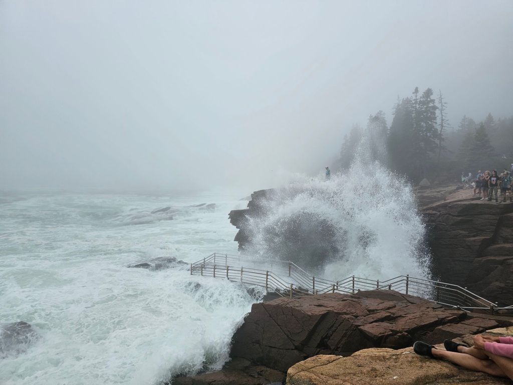 After the hike, we returned to the car and continued another 5 minutes down the road to Thunder Hole. There is a parking lot and restrooms here as well. Just about everywhere I looked online said the time to come was when the tide was low and incoming, but we weren’t really worried about that timing today. It wouldn’t have mattered anyway – due to the weather or what storm was going on in the ocean, the waves were HUGE. The waves breaking on the rocks created a spray that was at least 8 feet tall and gave you a healthy respect for the seas of mother nature if you hadn’t developed one already. We spent a considerable amount of time here watching the waves.